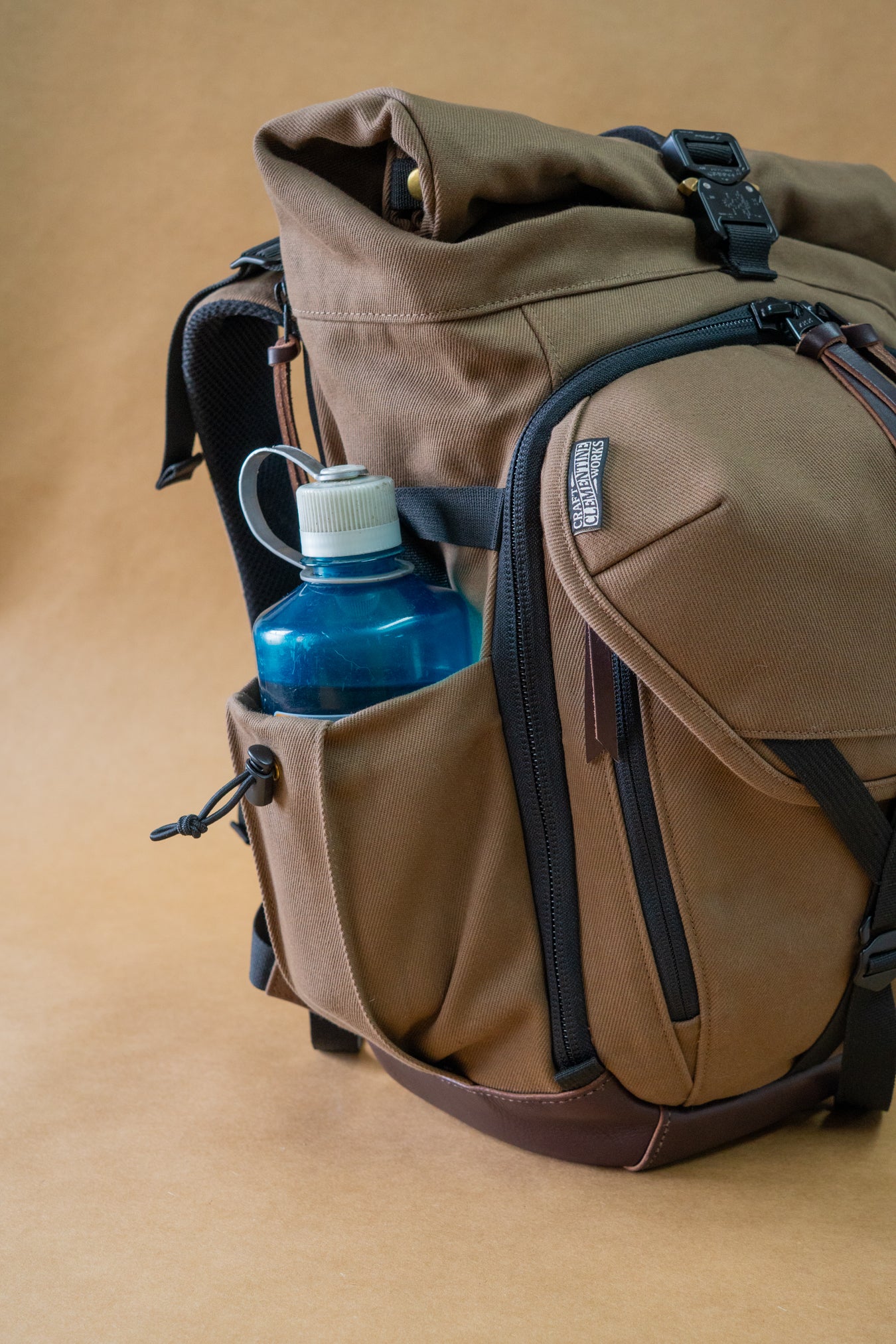 The bag features dual access to the main compartment through the front clamshell zipper, or the roll-top. The roll-top allows you to really stuff the bag, while the clamshell zipper lets you get at your stuff thats buried at the bottom. The expandable side pockets can fit bottles up to the width of a Nalgene, and have G-hook straps that allow you to secure taller items like a tripod. The top Y-strap can adjust to securely carry bulky items like a picnic blanket or yoga mat. The front pocket can be accessed through either side zip while wearing the pack, or opened all the up which gives you a clear view of the items inside. Inside, the flat pocket can fit books, devices, or papers, up to 8.5” x 11”. The optional external access laptop compartment can fit laptops up to 9” x 13.5”.